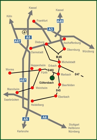 Autobahn Frankfurt-Karlsruhe: Ausfahrt Heppenheim, Weiterfahrt auf der B 460 (Siegfriedstraße) über Heppenheim - Fürth - Wegscheide - Hüttenthal nach Güttersbach.